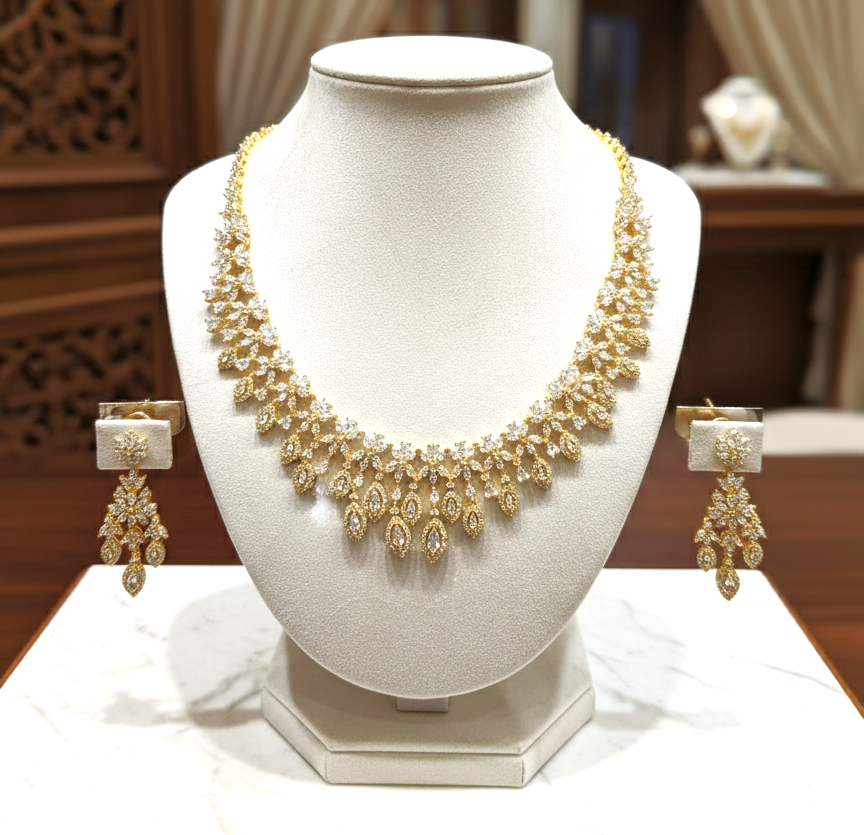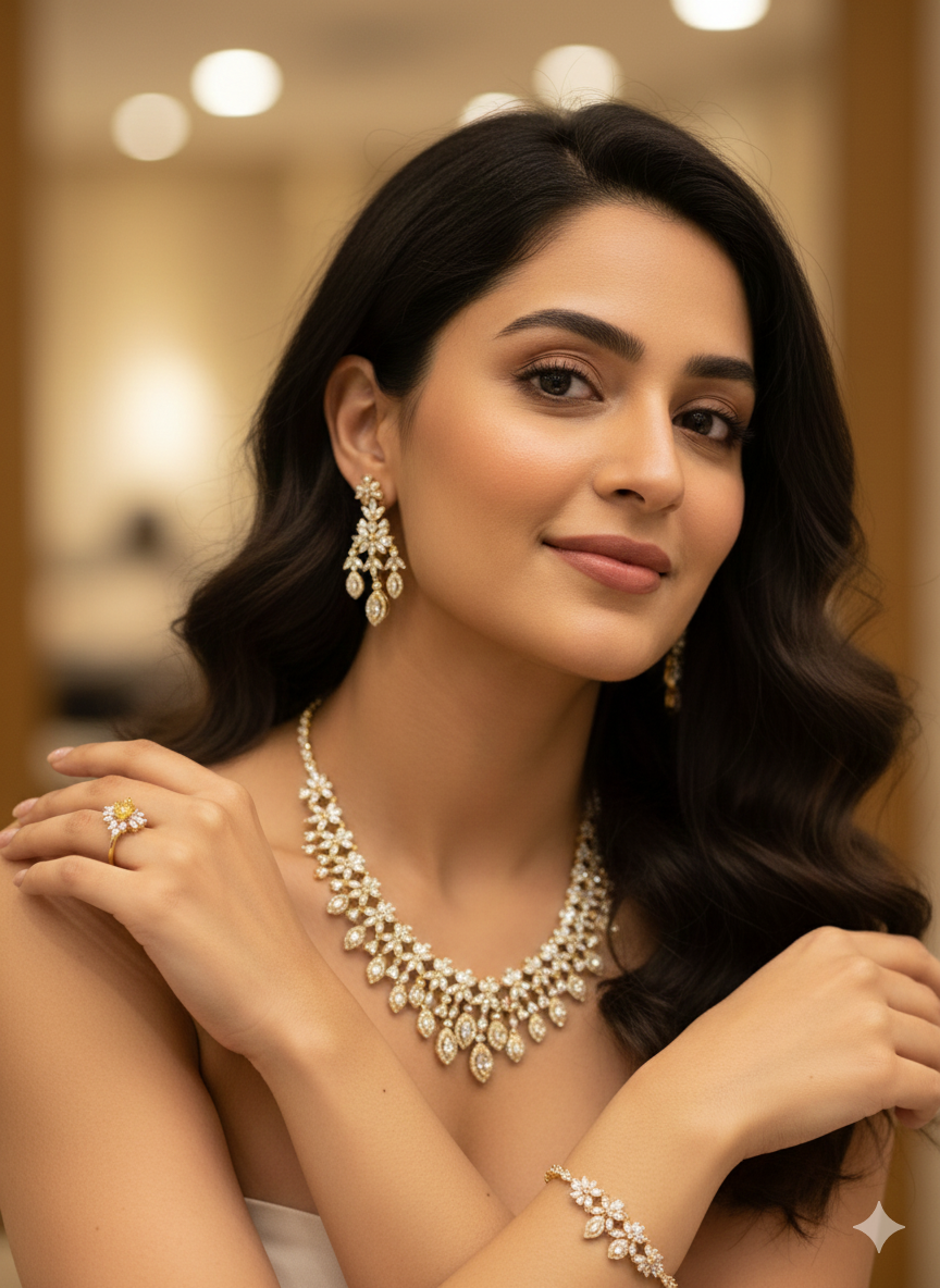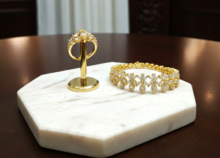 This exquisite gold-plated set, ensemble showcases a harmonious blend of radiant cubic zirconia stones for a perfectly coordinated aesthetic. The collection features a matching bracelet and a finger ring, all of which can be customized to your exact measurements for a flawless fit. Crafted from premium, lead-free materials, these pieces are designed to resist tarnishing and maintain their brilliant luster for years to come.