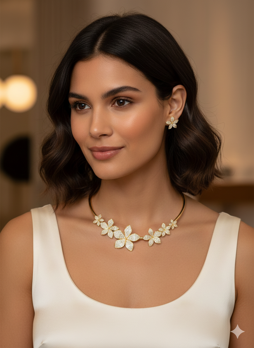 This exquisite gold-plated set, ensemble showcases a harmonious blend of radiant cubic zirconia stones for a perfectly coordinated aesthetic. The collection features a matching earring. Crafted from premium, lead-free materials, these pieces are designed to resist tarnishing and maintain their brilliant luster for years to come.